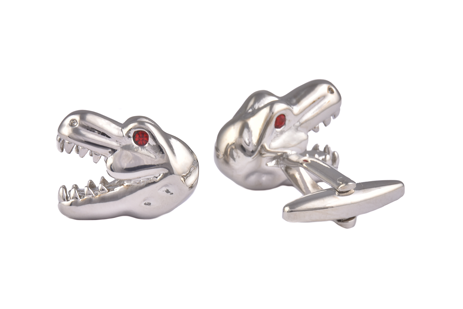 Ready to add a touch of prehistoric flair and a dash of quirky charm to your attire? Look no further! Our Dinosaur Head Cufflinks are here to help you unleash your inner dino enthusiast with style. Shaped like a fearsome dinosaur head in shiny silver, featuring an open mouth displaying sharp teeth and striking red eyes, these cufflinks are perfect for those who want to make a roaring statement with their fashion.